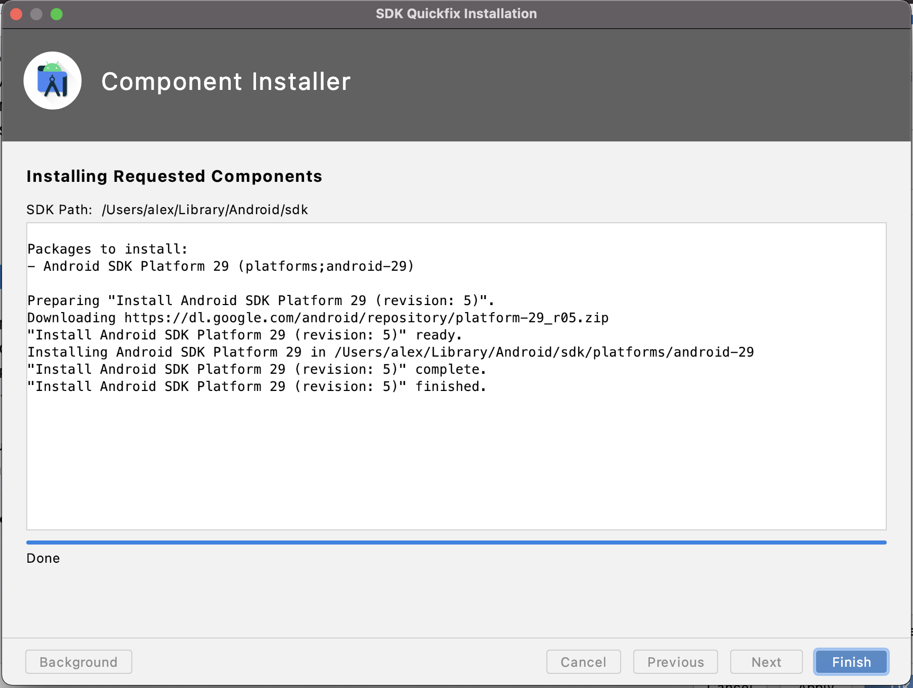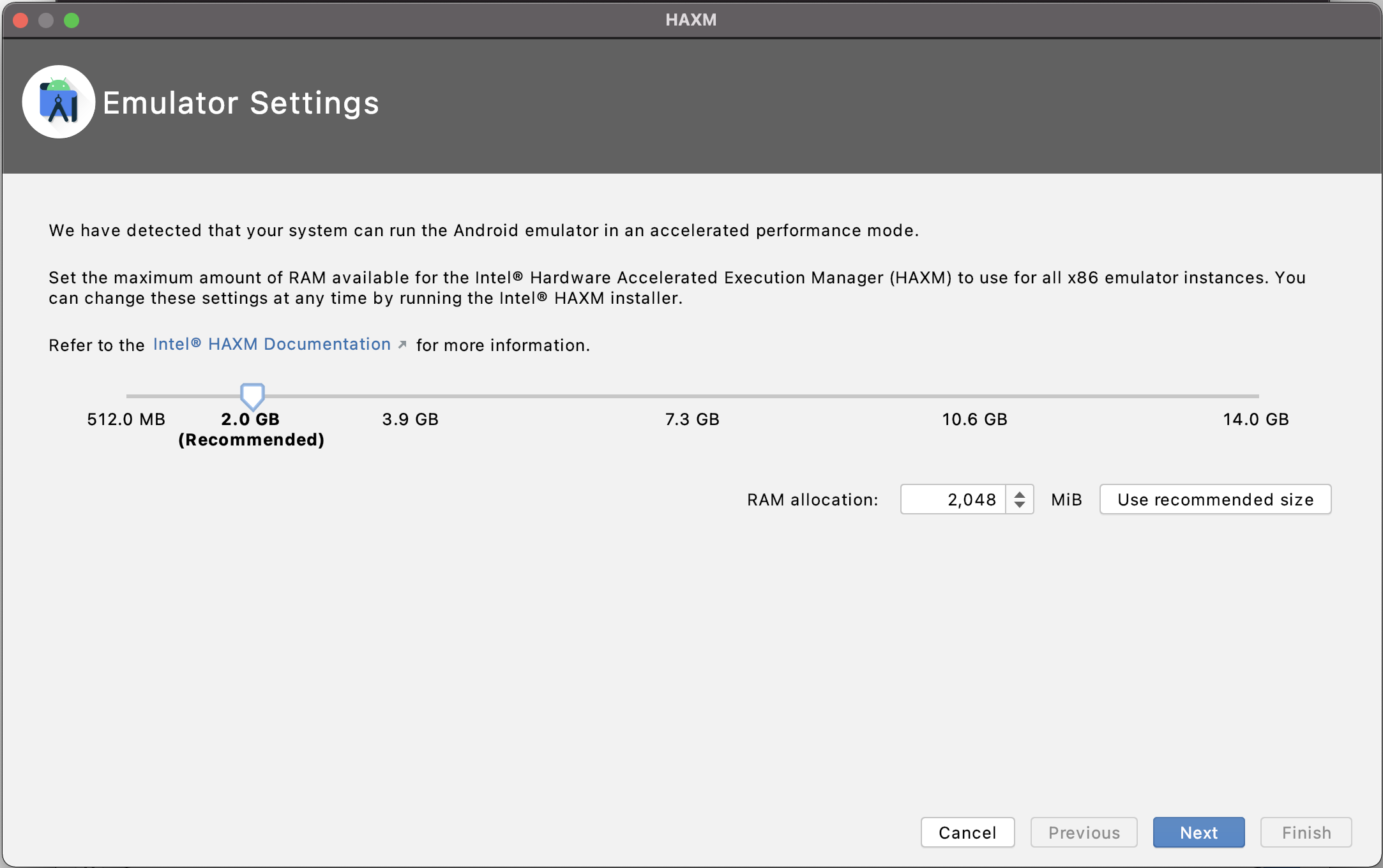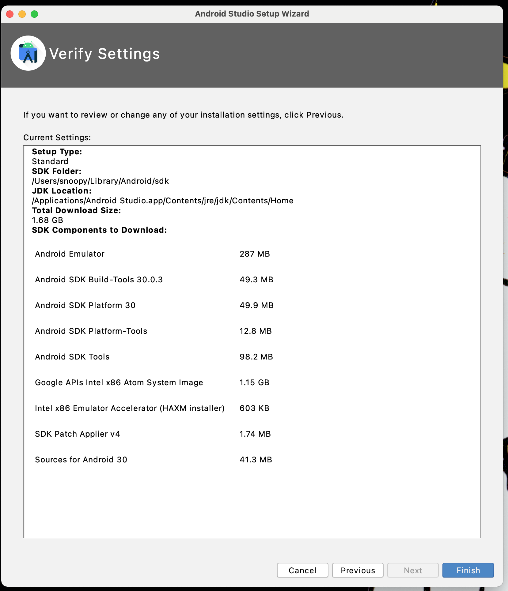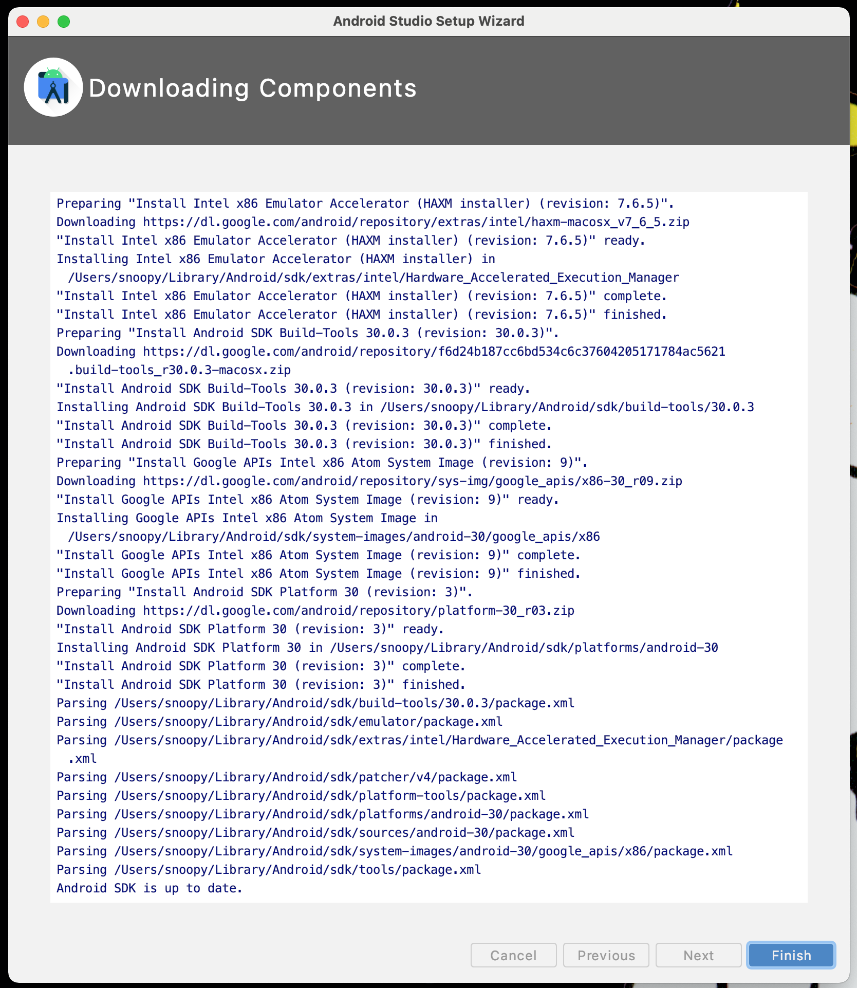 There is a security setting to be set in macOS for the installation of "Intel x86 Emulator Accelerator (HAXM installer)" before it can proceed. [Wonder in M1-based Mac computer such Accelerator is still needed? Do not know anything about the M1 architecture.]]