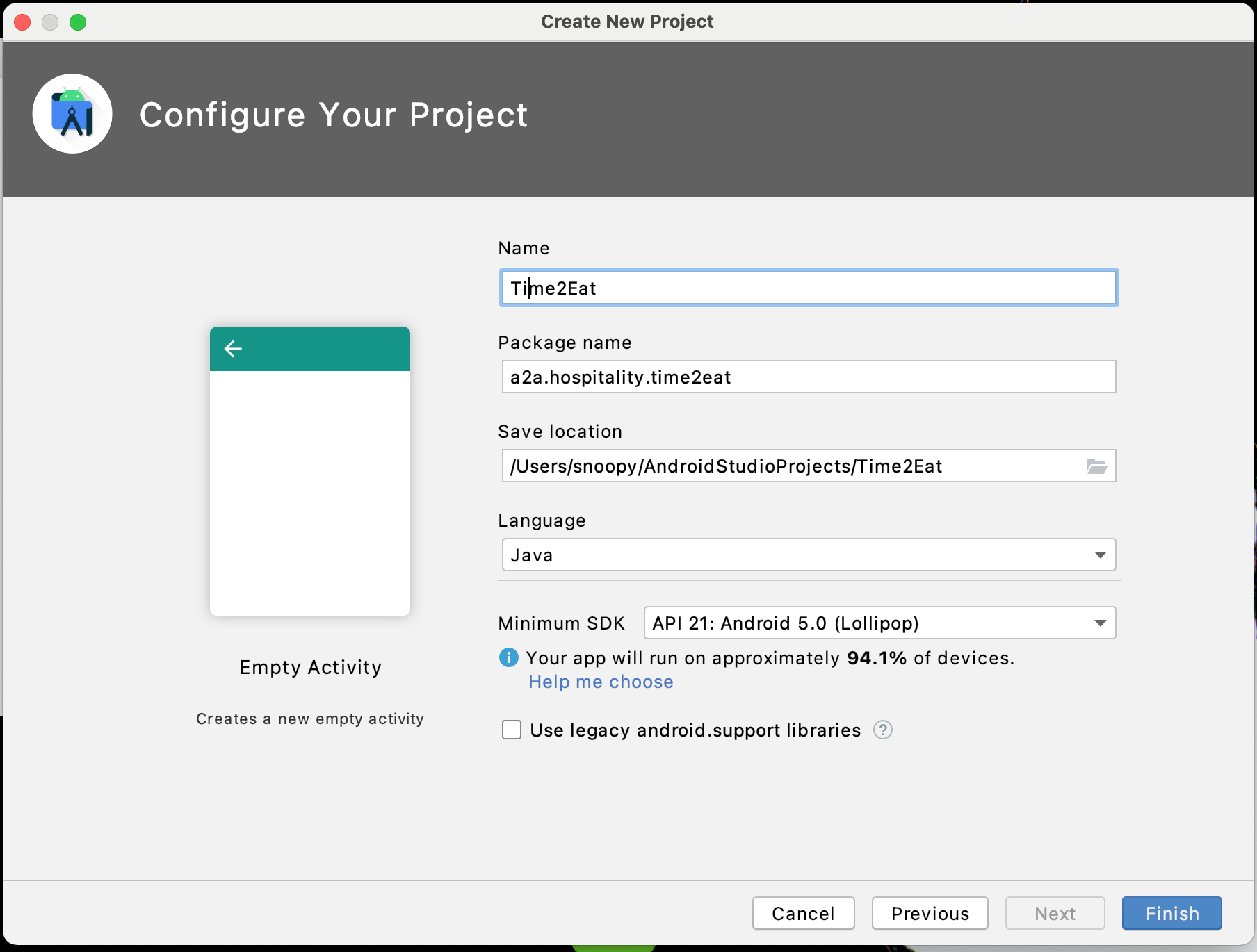 The applicatin name will be 'time2Eat' with other entries to be made. I change the