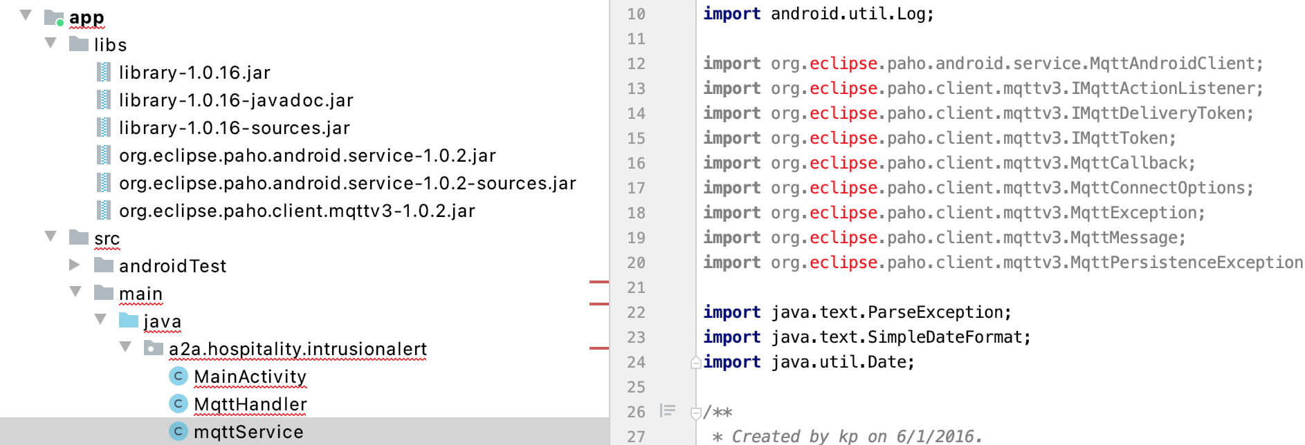 directory, and in app's build.gradledependencies { compile fileTree(include: ['*.jar'], dir: 'libs') testCompile 'junit:junit:4.12' compile 'com.android.support:appcompat-v7:23.1.1' compile 'com.android.support:design:23.0.0' compile files('libs/org.eclipse.paho.android.service-1.0.2.jar') compile files('libs/org.eclipse.paho.android.service-1.0.2-sources.jar') compile files('libs/org.eclipse.paho.client.mqttv3-1.0.2.jar') compile files('libs/library-1.0.16.jar') compile files('libs/library-1.0.16-javadoc.jar') compile files('libs/library-1.0.16-sources.jar') }In this new AS, all jars are put in directly in the flat directory, and the build.gradle is edited with additional lines in 'dependencies' hopefully to eliminate the indicative compilation errors as