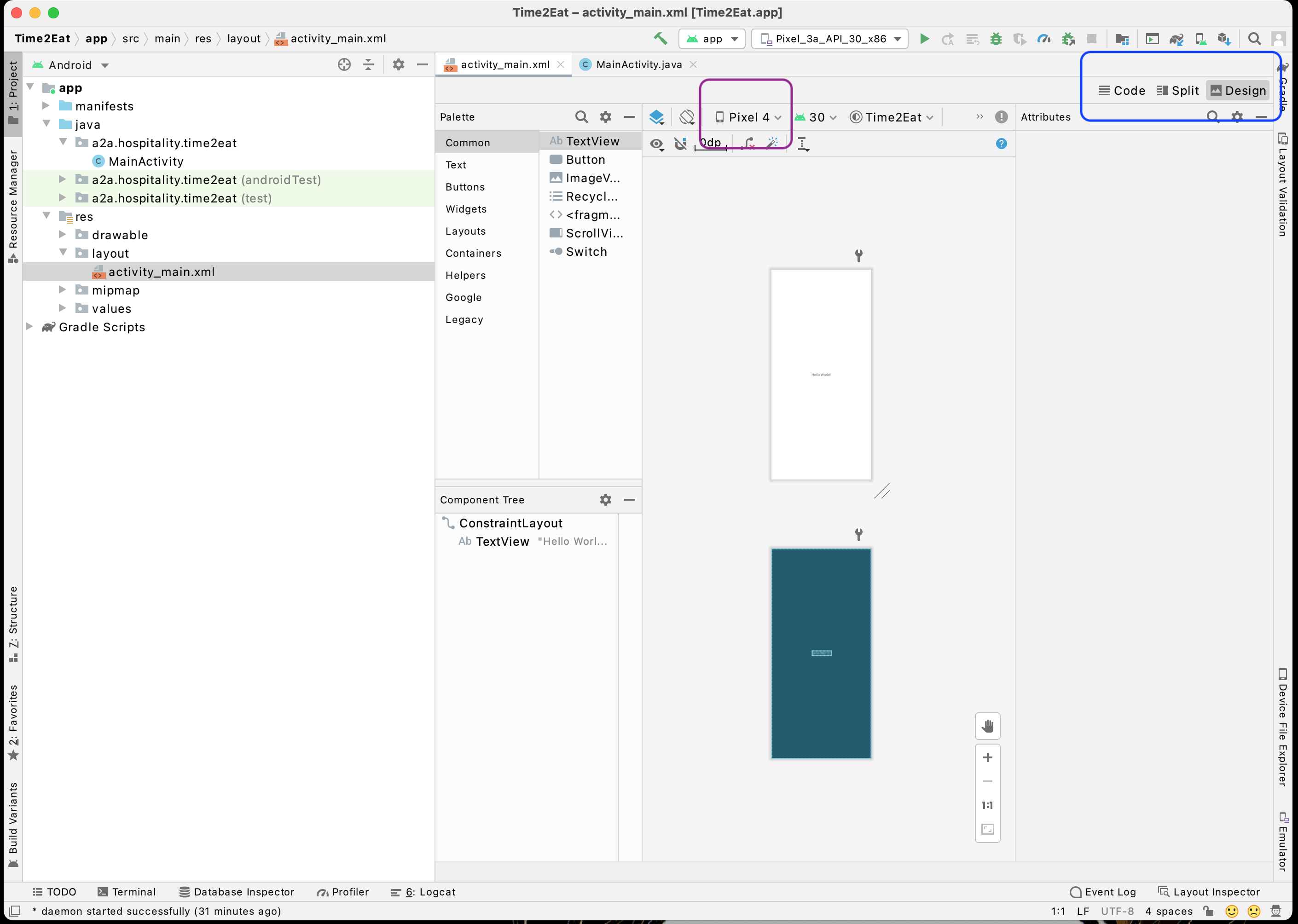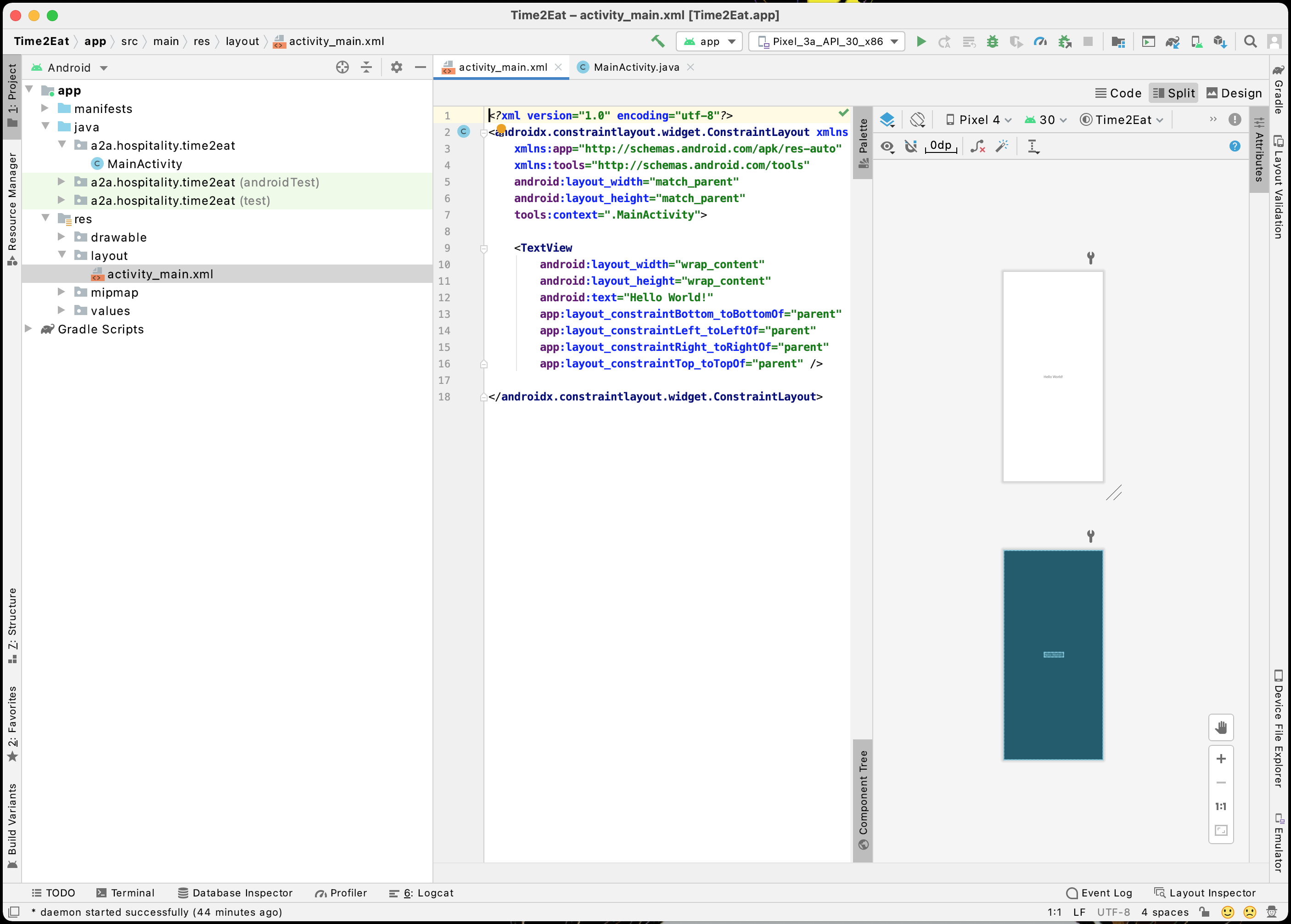 Bringing up the 'activity_main.xml' for editing (in a Code view), I change the 'Hello...'